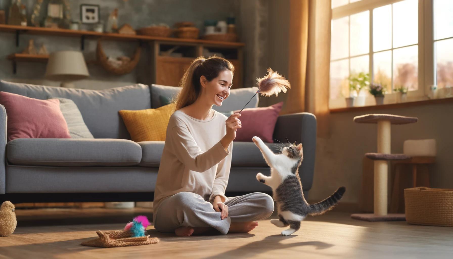 벌레는 벌레처럼 빠르게 쥐는쥐처럼바닥을 다니면서  새는 새처럼 높이 날으듯 실제와 비슷하게 사냥 본능을 자극해 주세요. 사냥을 마무리할 때 고양이가 흥분한 상태에서 바로 끝내지 않습니다. 서서히 장난감의 움직임을 늦추면서 사냥감이 상처 입은 것처럼 보여주며 고양이의 흥분도를 낮추고 마지막 사냥의 성공시켜서 자신감을 줍니다.